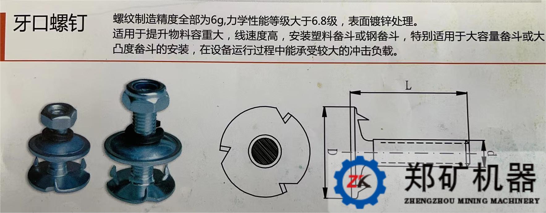 TD型膠帶式提升機(jī)采用膠帶作為料斗的牽引部件。料斗用具有特殊頭部的螺釘(牙口螺釘)固定在帶子上,為了使螺栓的頭部不妨礙膠帶通過(guò)滾筒,在料斗的后壁上制有相應(yīng)的凹槽。膠帶的寬度要根據(jù)膠帶的標(biāo)準(zhǔn)選取,帶寬應(yīng)比料斗的寬度在30-40mm。帶的帆布層數(shù)應(yīng)根據(jù)帶子所受的最大牽引力計(jì)算確定(通常不少于4層),計(jì)算方法同帶式輸送機(jī),但由于膠帶上鉆了連接料斗的孔,降低了膠帶的強(qiáng)度,所以應(yīng)比膠帶輸送機(jī)驗(yàn)算膠帶強(qiáng)度的安全系數(shù)增大10%左右。
