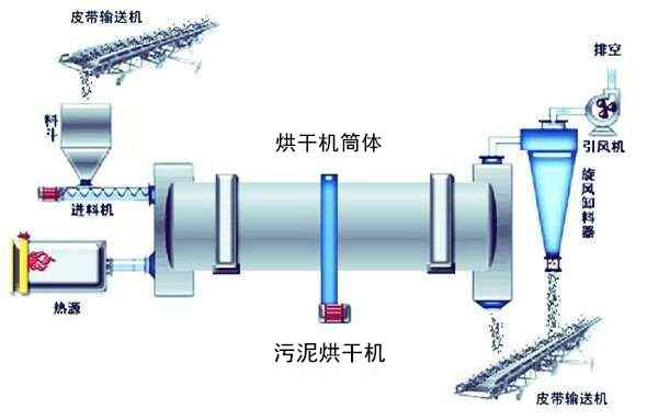 污泥由給料機(jī)經(jīng)溜槽進(jìn)入污泥烘干機(jī)內(nèi)導(dǎo)料板上,隨著筒體的轉(zhuǎn)動,污泥被導(dǎo)至傾斜揚(yáng)料板上即被提升到筒體的中心位置,逐漸灑落形成料幕,高溫氣流從中 穿過,使污泥預(yù)熱并蒸發(fā)部分水分。當(dāng)污泥灑落、移動到活動的篦條式翼板上時,物料又與預(yù)熱過的篦條式翼板夾雜在一起,將熱量傳給物料,使部分水分蒸發(fā)。同時,翼板夾帶物料提起、灑落,重復(fù)多次,物料與熱氣流進(jìn)行對流和接觸熱交換。同時埋在物料中的清掃裝置,也沿圓弧形揚(yáng)料板的里側(cè)下滑,把揚(yáng)料板內(nèi)壁粘附的 物料清掃下來。當(dāng)清掃裝置隨筒體轉(zhuǎn)過垂直線以后,又在圓弧揚(yáng)料板背面拖動,將其粘附在揚(yáng)料板外壁的物料清掃下來。隨著污泥烘干機(jī)筒體的不斷轉(zhuǎn)動,使部分水 分蒸發(fā),污泥得到進(jìn)一步干燥。同時,清掃裝置對污泥團(tuán)球也起到了打碎作用,提高了干燥速度,后污泥干燥后變成低水分的松散物料,由污泥烘干機(jī)出料口排出。